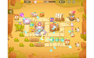1、開局,我們在地圖左上角靠近蘿卜的地方,搭建三個火瓶,兩個升三級,一個升兩級,應付前幾波的兔子。