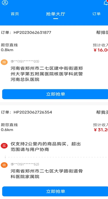 在搶單大廳里,訂單數量非常多,每個用戶都可以迅速完成搶單操作。
