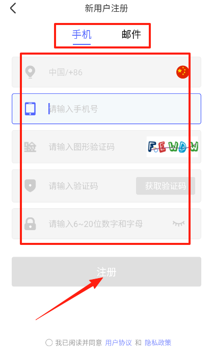 選擇是手機注冊還是郵箱注冊,填寫相應的信息。