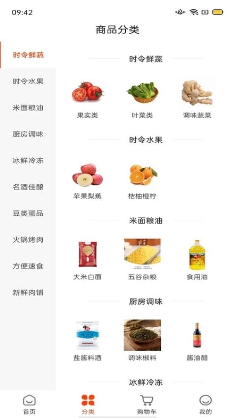首頁:陳列各類生鮮食品,用戶能夠依據分類、價格等條件篩選商品。